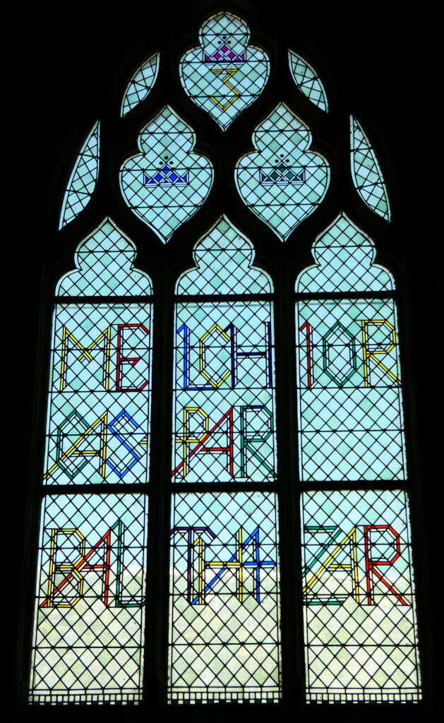 C’ est Matthieu (2/1-12) qui raconte la visite des mages. Ni leur nom, ni le nombre trois ne figurent dans l’évangile. Les noms viennent de textes orientaux du VI° siècle.